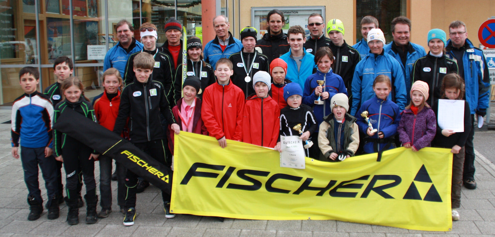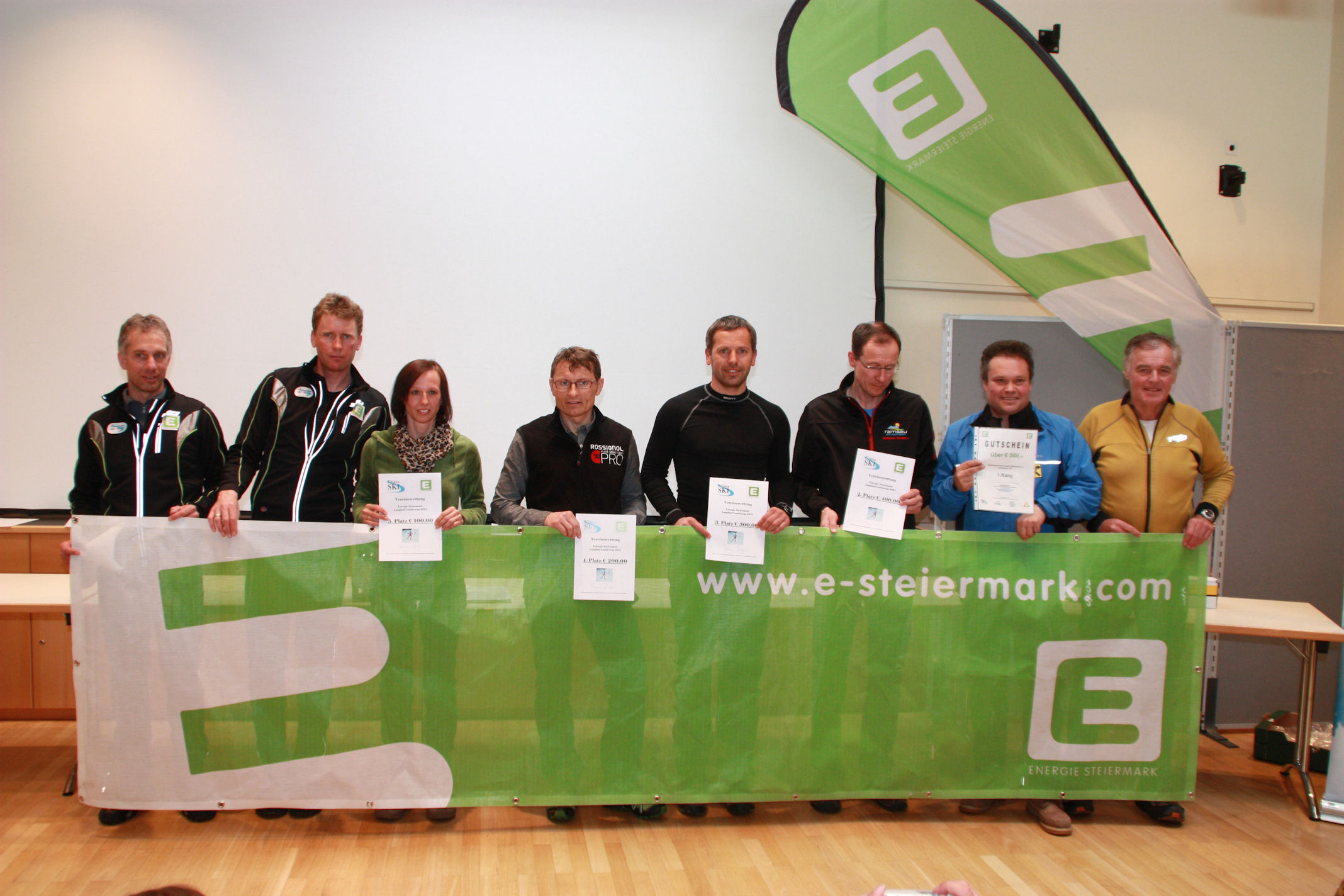 Für die fünf bestplatzierten Vereine gab es Geldpreise. Energie Steiermark ist der Hauptsponsor dieser Landescupserie. Vlnr: Andre Blatter (Steir. Nachwuchstrainer), Ing. Achim Walcher (Langlaufreferent) mit den Teamverantwortlichen: Barbara Unterweger (5. Rg. SK Rottenmann), Toni Wippel (4. Rg. SK RB Admont/Hall), Fritz Eder (3. Rg. WSV Murau), Dr. Alois Stadlober (2. Rg. WSV Ramsau), Toni Dietrich sen. (1. Rg. UNSC Kobenz) sowie Hans Hörzer (Vizepräs. d. Steir. Schiverbandes).